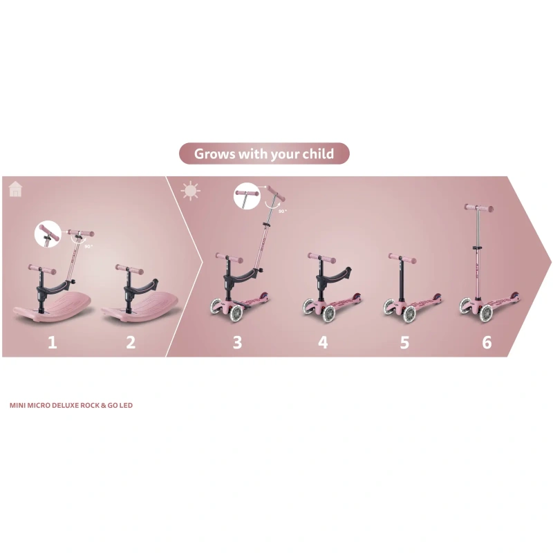 Micro Mini Deluxe Rock & Go LED tõukeratta saab ilma tööriistu kasutamata muuta kergelt kuueks erinevaks versiooniks. Pere pisemad saavad seda kasutada sisekiiguna ja veidi suuremad lapsed täisfunktsionaalse tõukerattana. Ja seda ühel ning samal ajal, st Rock & Go saab olla korraga kasutuses kahe lapse poolt! Nutikas lahendus peredele, kus kasvab korraga vähemalt kaks kuni kuueaastast last!